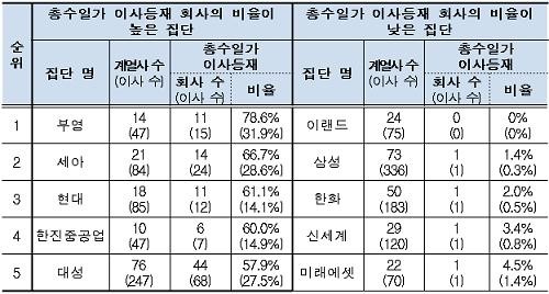 반면 총수일가의 이사등재 비율이 높은 기업은 부영 78.6%, 세아 66.7%, 현대 61.1% ·한진중공업 60.0%, 대성 58.9% 순이었다. 현대, 부영·롯데, 한진·대성·세아, 자동차·한진중공업에서도 총수가 계열사의 이사로 등재돼 있었다.