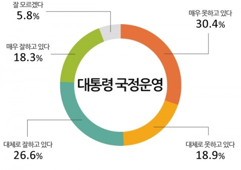 이는 직전 조사인 지난달 17~18일 국정운영 평가 결과인 ‘잘함’ 47.1%, ‘잘못함’ 46.5%보다 긍정평가는 2.2%p 떨어지고 부정평가는 2.8%p 오른 수치다.