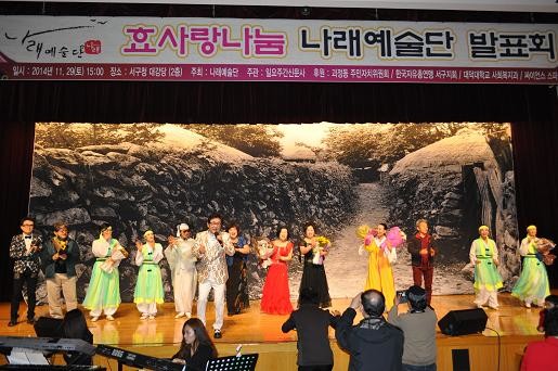 양 단장은 “2014년 한해를 마무리하며, 매년 정기적으로 개최하는 <효·사랑나눔> 공연 무대에 다시 오르니 감회가 새롭다”며 “해마다 물심양면으로 돌아주신 분들 덕분에 틈틈이 익힌 재능을 무대에 올릴 수 있었다”며 감사의 뜻을 전했다.