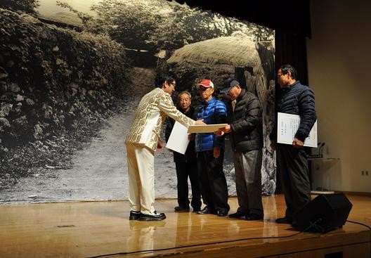 | ▲ 양용모 나래예술단 단장이 ‘사랑 나눔 쌀 증정식’에서 대전시 서구 4개동 (도마동·가수원동·복수동·괴정동)의 어르신 대표에게 나눔증서를 전달하고 있다. | ||