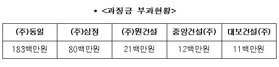 공정위는 적발 결과를 토대로 법 위반 금액이 크거나 과거 위반 전력이 있는 5개 건설사에 대해 시정명령과 함께 총 307백만 원의 과징금을 부과하기로 결정했다.
