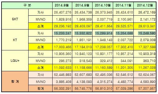 지난달 26일 미래창조과학부가 공개한 ‘무선통신 가입자 통계’에 따르면 지난해 알뜰폰을 제외한 이통3사의 가입자 수는 지난 11월 5254만 6,512명에서 5,262만 4,067명으로 증가했다.