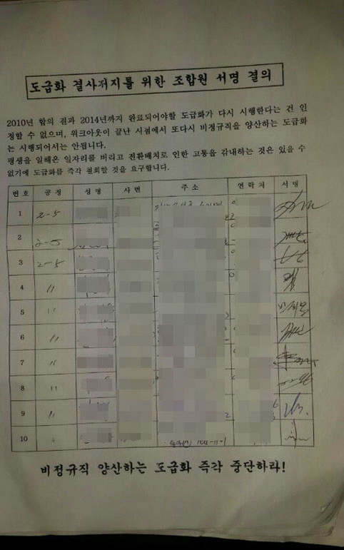 노조는 분신 이후 김씨의 차량에서 유서와 함께 ‘도급화 결사 저지를 위한 조합원 서명 결의서’를 발견했다.