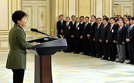 | ▲ 취임 2주년을 맞은 박근혜 대통령이 25일 청와대에서 열린 직원 조회에 참석해 격려사를 하고 있다. ⓒNewsis | ||