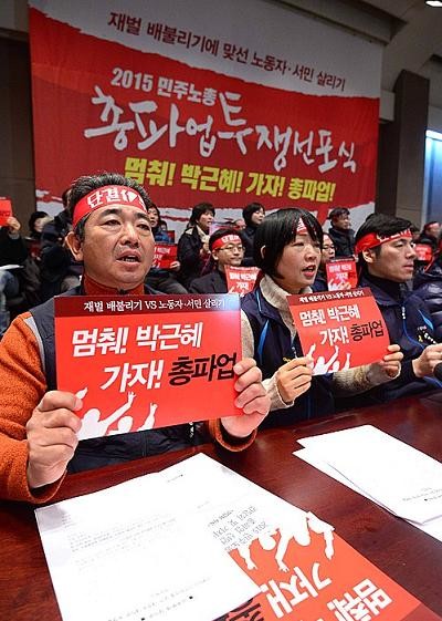 한상균 민주노총 위원장은 "박 대통령에게 단독회담을 요구한다"며 "박근혜 대통령이 3월 31일까지 요구에 응하지 않을 경우, 민주노총은 4월 총파업을 시작으로 범국민적 투쟁에 돌입하겠다"고 전면했다.