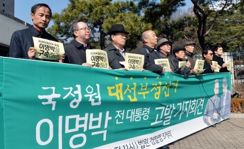 26일 서울 서초구 서초동 서울중앙지검 앞에서 한국진보연대와 민주사회를위한변호사모임, 민주국민행동 등 시민단체들이 국정원 불법 대선개입에 대한 이 전 대통령의 구속수사를 촉구하는 기자회견을 열고 이 전 대통령을 공직선거법, 국가정보원법 위반 혐의로 서울중앙지검에 고발했다.