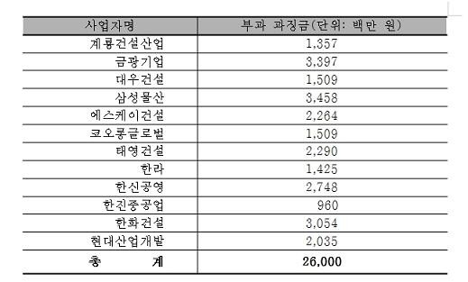 담합에 참여한 건설사는 한라ㆍ계룡건설ㆍ태영건설ㆍ한신공영ㆍ한진중공업ㆍ한화건설(만경 5공구)과 SK건설ㆍ금광기업ㆍ대우건설ㆍ코오롱글로벌(동진 3공구), 삼성물산ㆍ현대산업개발(동진 5공구) 등이다.