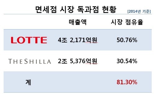 15일 국회 기획재정위원회 전체회의에서 박영선 새정치민주연합 의원은 "롯데와 호텔신라는 이미 공정거래법상 '시장지배적 사업자'이므로 시내면세점에 대한 신규특허는 재고되어야 한다"며 이같이 지적했다.