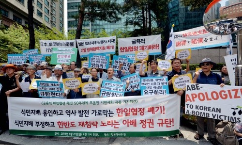 22일 서울 종로구 외교부와 일본대사관 앞에서 '평화와통일을여는사람들(평통사)'을 포함한 9개 시민단체들은 "아베 정권은 침략과 식민지배를 부정하고 집단자위권 행사를 꾀하며 한반도 재침략을 노리고 있다"고 규탄했다.