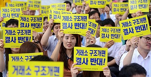 거래소 노동조합 회원들은 26일 서울 태평로 금융위원회 앞에서 코스닥시장 분리와 거래소 구조개편 추진 중단을 촉구하는 기자회견을 열었다.
