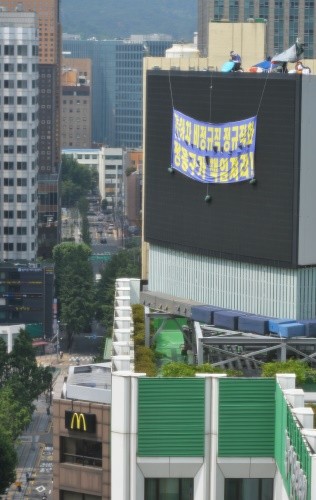 이에 이들은 지난 11일부터 전광탑 앞에 '기아차 비정규직 정규직화 정몽구가 책임져라'는 현수막을 걸고 무기한 고공농성에 돌입했다.