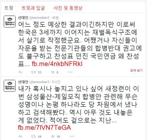 이어 “어쨌거나 자신들이 자문을 받는 전문기관들의 합병반대 권고에도 불구하고 찬성표 던진 국민연금 왜 찬성표...”라며 삼성물산 최대주주인 국민연금을 애둘러 비판했다.