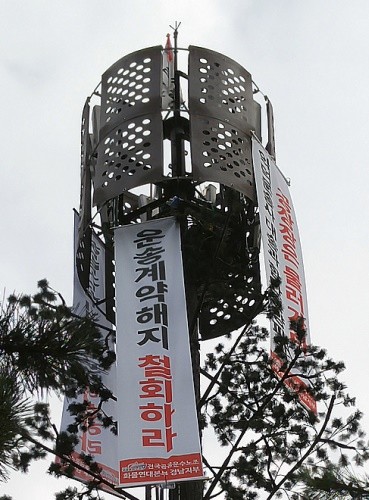 앞서 이들은 지난달 30일부터 CJ대한통운 측에 노조 간부에 대한 고소․고발과 손해배상 청구․가압류 신청 철회를 요구하며 광고탑 위에서 시위를 펼쳐왔다.