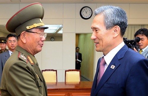 | ▲김관진 국가안보실장(우측)과 황병서 인민군 총정치국장(좌측). ⓒNewsis | ||