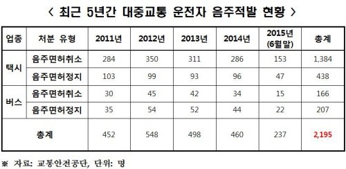 국회 국토교통위원회 소속 새누리당 이노근 의원에 따르면 지난 2011년부터 올해 6월까지 음주운전으로 적발된 대중교통 운전자는 총 2,195명으로 집계됐다. 택시 운전자의 음주운전이 1,822명이였고 버스 음주운전자는 373명이 적발됐다. 이 중 면허 취소에 해당하는 음주운전자는 총 1,550명, 면허를 정지당한 음주운전자는 총 645명으로 나타났다.