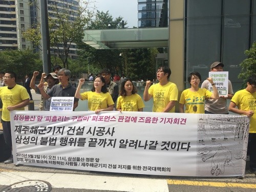 이들은 “당시 삼성물산은 경비원들을 동원해 행위자들 스스로의 몸에 페인트를 뿌리는 작은 퍼포먼스를 폭력적으로 진압했다”며 “제주해군기지 건설 공사와 관련해서도 온갖 절차를 무시했을 뿐만 아니라 문화재보호법, 환경영향평가법 등을 어기며 심각한 불법과 환경파괴를 자행했음에도 지금까지 아무런 책임을 지지 않고 있다”고 주장했다.