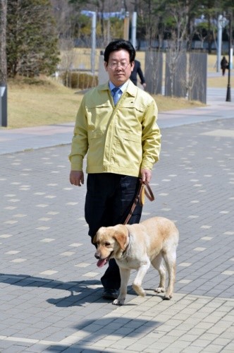 | 이재명 성남시장과 유기견 행복이의 다정한 모습(사진=성남시 제공) | ||