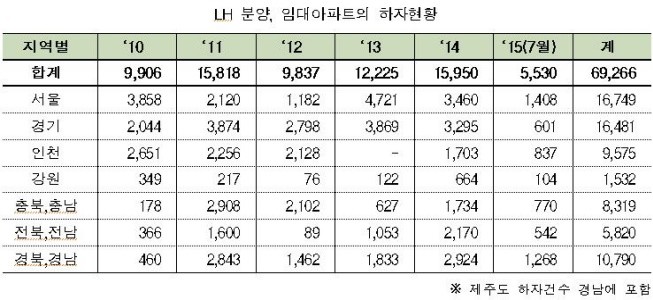 LH분양아파트의 경우는 지난 2012년부터 2015년 7월 현재까지 분양아파트 6만 5,613가구에서 총 2만 5,502건(38.9%)의 하자가 발생한 것으로 나타났다.