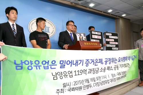 이날 기자회견에는 국회 정무위원회 소속 새정치민주연합 민병두 의원(동대문구을)을 비롯해 남양유업 대리점 점주들을 대표해 장성환, 김종섭, 안희대, 김대형, 이송영 대리점 점주 5명이 함께했다.