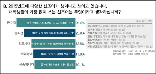 또한 ‘2015년도에 다양한 신조어가 나왔는데 대학생들이 가장 많이 쓰는 신조어는 무엇?’이라는 질문에는 31%가 응답한 금수저가 올해 대학가 최고의 신조어로 꼽혔다.