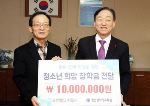 유한킴벌리는 지난 2012년부터 매년 장학금 1,000만 원 씩을 기탁해오고 있으며 기탁받은 장학금 1,000만 원은 대전시 관내 중․고등학교에 전달돼 우수 인재 육성을 위한 장학금으로 사용하게 된다.