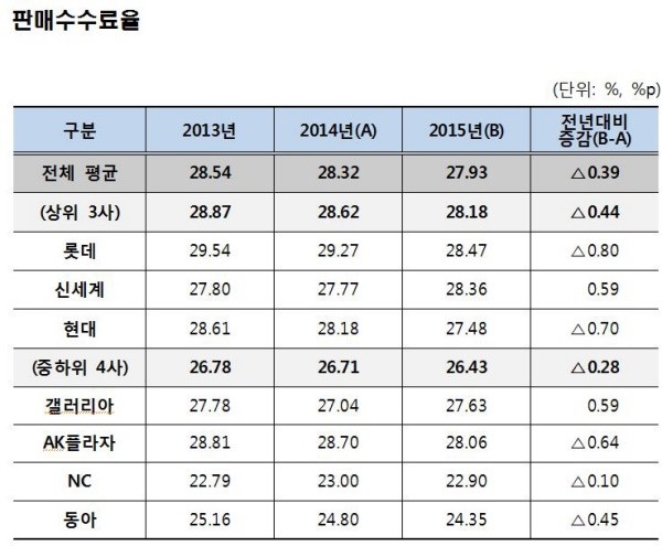 지난 28일 공정거래위원회(이하 공정위)가 내놓은 ‘2015년 백화점·TV홈쇼핑 판매수수료율 분석결과’에 따르면 올 한해 백화점 7개사의 판매수수료율은 27.9%로 롯데(28.5%)의 판매수수료율이 가장 높은 것으로 나타났다. 이어 신세계(28.4%), AK플라자(28.1%), 갤러리아(27.6%), 현대(27.5%), 동아(24.3%), NC(22.9%) 등이 그 뒤를 따랐다.