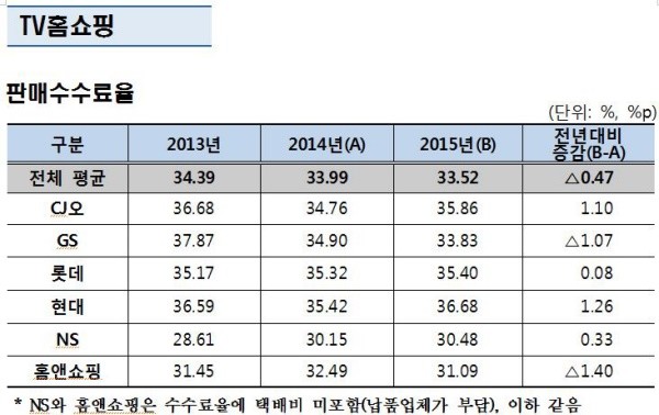 ‘2015년 백화점·TV홈쇼핑 판매수수료율 분석결과’에 의하면 대기업 납품업체 평균 판매수수료율은 현대홈쇼핑이 37.0%로 가장 높았으며 롯데홈쇼핑, NS홈쇼핑, GS홈쇼핑, CJ오쇼핑, 홈앤쇼핑 등이 각각 30.8%, 29.7%, 34.0%, 35.6%, 27.9%로 조사돼 그 뒤를 따랐다.
