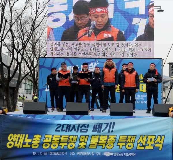 29일 오후 서울 종로구 세종대로 정부서울청사 앞에서 열린 양대노총 공동투쟁 및 불복종 선언운동 선포식에서 금속노조 김상구 위원장, 화학노련 김동명 위원장은 정부의 공공기관 성과연봉제 지침에 반대하는 선포문을 발표했다.