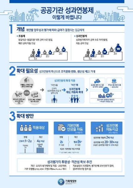 정부는 공공기관의 업무에 따른 공정한 보상과 느슨한 근무 분위기를 깨고 경쟁 부재로 인한 비효율, 근무연수와 자동승급에 따른 인건비 부담을 타파하기 위해서라고 밝혔다.