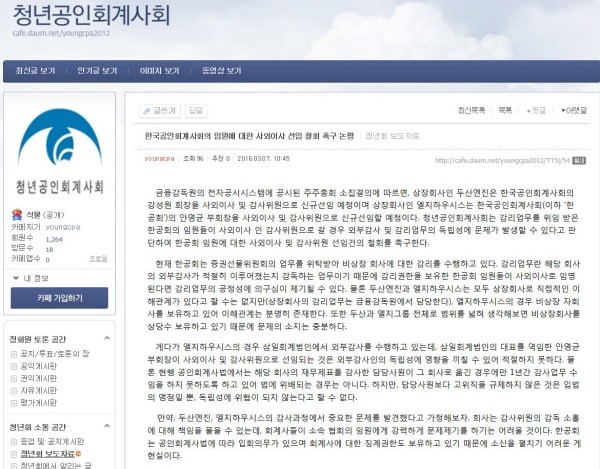 지난 7일 청년공인회계사회는 논평을 통해 "금융감독원 전자공시시스템에 공시된 주주총회 소집결의를 분석한 결과 한국공인회계사회(이하 한공회) 강성원 회장이 두산엔진의 사외이사를, 안영균 한공회 부회장이 LG하우시스의 사외이사를 겸직하는 것은 회계 독립성을 저해하는 행위”라고 목소리를 높였다.