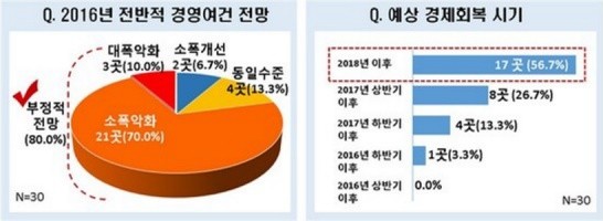 또한 예상 경제회복 시기에 대해서도 30대그룹 중 96.7%가 ‘2018년 이후’(56.7%) 또는 ‘2017년 이후’(40.0%)가 될 것으로 응답해 경기 부진이 상당기간 지속할 것으로 내다봤다. 올해 하반기 이후를 점친 그룹은 단 1곳에 그쳤고 상반기 이후 회복을 예상한 그룹은 한 곳 조차 없었다.