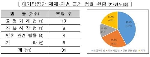 [일요주간=김완재 기자] 10일 전국경제인연합회는 대기업집단에 대해 공정거래법·자본시장법 등 11개 법률의 31개 조항에서 제재·처벌규정 총 65개를 확인하고 발표했다. '자산총액 5조원 이상 대기업집단 제재·처벌규정 현황' 자료를 보면 대기업집단에 대한 31개 제재·처벌조항은 공정거래법이 13개(41.9%)로 가장 많았고, 자본시장법 8개(25.8%), 방송법 등 언론 관련 법률 4개(12.9%), 기타 6개(19.4%)가 뒤따랐다.
