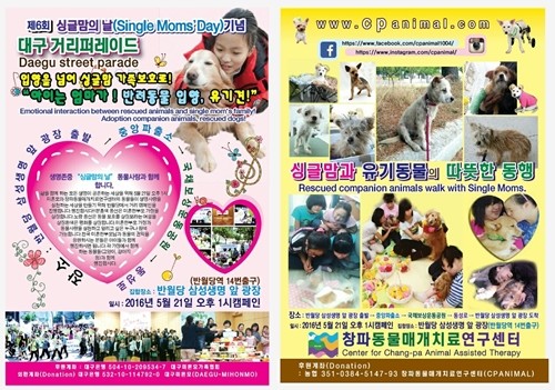 [일요주간 = 노현주 기자] 사단법인 창파동물매개치료연구센터와 대구미혼모가족협회는 오는 21일 토요일 1시부터 대구 반월당 삼성생명 앞 광장에서 '제1회 싱글맘의 날 기념 대구 퍼레이드'를 개최한다고 18일 밝혔다.