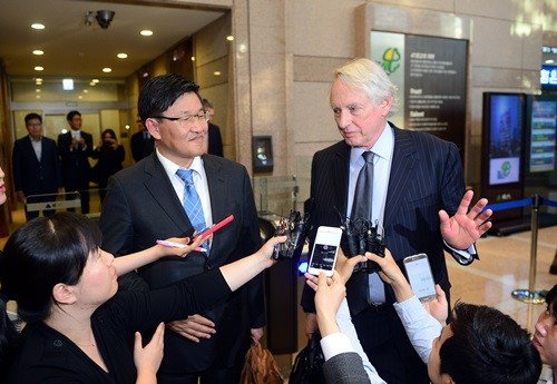 | ▲ 정용석 KDB산업은행 부행장과 현대상선측 용선료 인하 협상을 주도한 마크 워커(오른쪽) 미국 밀스타인 법률사무소 변호사가 취재진의 질문에 답변하고 있다. | ||
