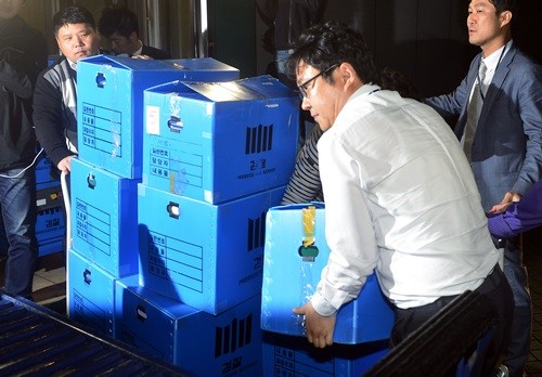 | ▲ 정운호 네이처리퍼블릭 대표의 법조비리 의혹과 각종 로비 의혹을 수사하고 있는 검찰이 3일 오후 서울 강남구 대치동 네이처리퍼블릭 본사를 압수수색 한 뒤 압수품을 옮기고 있다. (사진제공=뉴시스) | ||