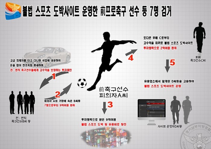 경기남부지방경찰청 사이버수사대는 사기 및 국민체육진흥법 위반 등 혐의로 프로축구 선수 출신인 A(31)씨 등 3명을 구속하고, B(31)씨 등 4명을 불구속 입건했다고 12일 밝혔다.