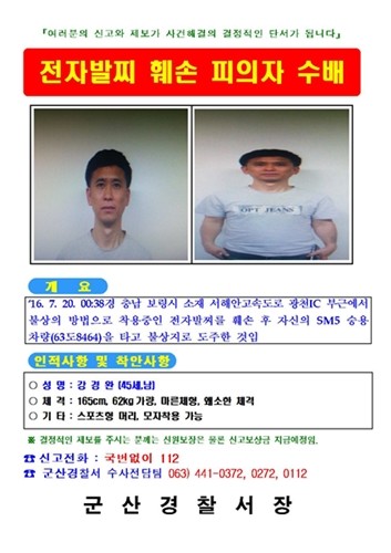 경찰은 강씨의 구형 SM5(63도 8464) 차량이 가평에 나타났다는 첩보를 입수하고 현장으로 출동해 차에 타고 있던 강씨를 붙잡아 군산으로 압송 중이다.