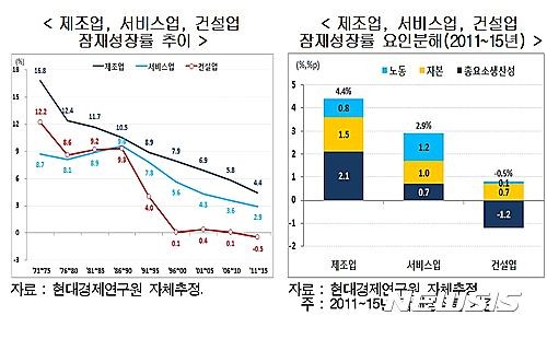 국내 제조업 잠재성장률은 1991~1995년 8.9%에서 1996~2000년 7.9%, 2001~2005년 6.9%, 2006~2010년 5.8%로 5년 간격으로 약 1%포인트씩 내려갔다. 하지만 최근 국내 제조업 잠재성장률(2011~2015년)은 4.4%로 5년 전 잠재 성장률보다 1.4%포인트 하락하면서 낙폭을 키웠다.