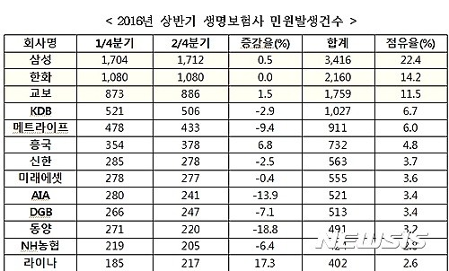 민원발생건수는 총 1만5255건으로 이 중 삼성생명이 3416건으로 22.4%를 차지했다. 한화생명 2160건(14.2%), 교보생명 1759건(11.5%) 등의 순이었다. 이들 3개 보험사의 점유율은 48.1%로 절반에 육박했다.
