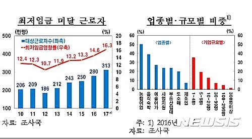 이에 따르면 최저임금 미만을 받는 근로자 수는 지난 2010년 206만명에서 올해 280만명으로 늘고, 2017년엔 313만명으로 확대될 것으로 전망됐다.