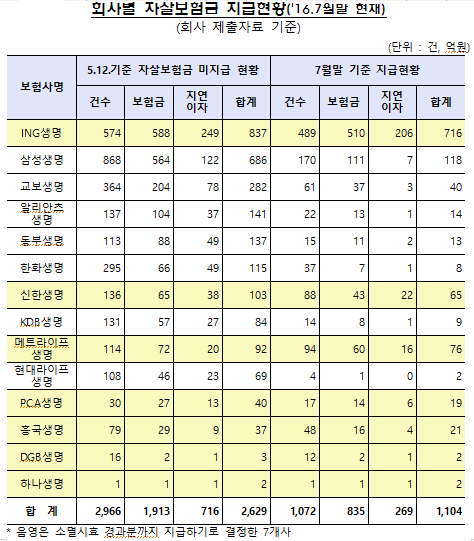 22일 국회 정무위원회 민병두 의원(더불어민주당)이 금융감독원으로부터 제출받은 자료에 따르면 7월 말까지 지급한 자살보험금은 1104억원으로 14개 생보사 전체에서 지급해야 하는 자살보험금 2629억원의 42%에 그쳤다. 1525억을 내주지 않은 것이다.
