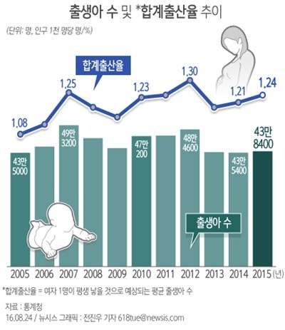 24일 통계청이 발표한 2015년 출생통계에 따르면 지난해 모(母)의 평균 출산 연령은 32.2세로 전년(32.0세) 대비 0.2세 상승했다.