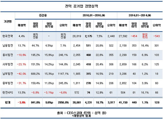 24일 기업 경영성과 평가사이트 CEO스코어에 따르면 한국전력, 남동발전, 서부발전, 동서발전, 중부발전, 남부발전, 한전KPS 등 7개 전력 공기업의 상반기 영업이익률은 평균 10.7%로 조사됐다.
