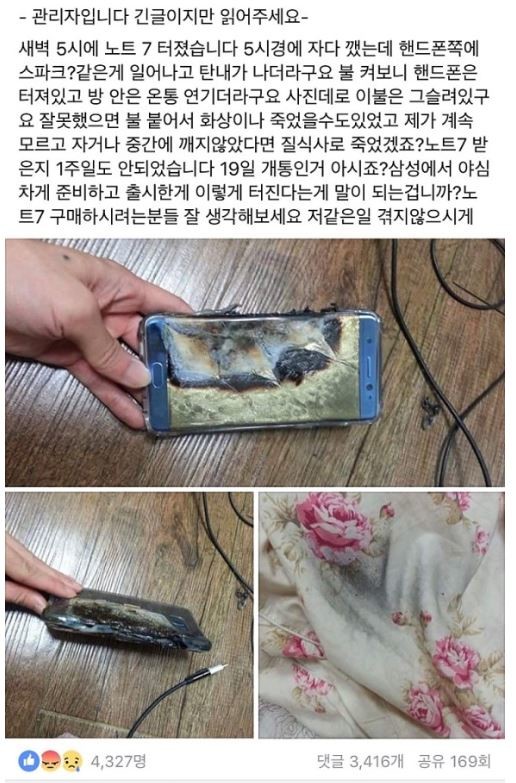 그는 지난 24일 온라인 커뮤니티인 뽐뿌에 “갤럭시노트7 폭발 당사자입니다”라고 밝히며 “현재 조작이다. 전자레인지에 돌린거다 하시는데 그런 거 없습니다”라고 말했다.