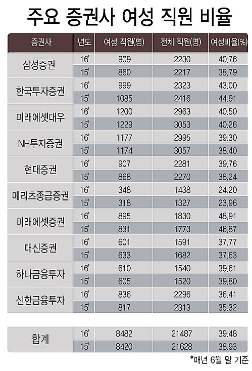 또 현대증권(38.24→39.76%), 신한금융투자(35.32→36.41%), NH투자증권(38.40→39.30%), 메리츠종금증권(23.96→24.20%), 미래에셋대우(40.26→40.50%), 대신증권(37.63→37.77%) 등도 여성 직원 비율이 증가했다.