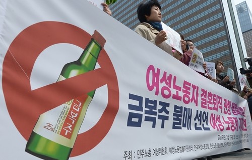 | ▲ 지난 3월 29일 오전 서울 종로구 광화문광장에서 열린 ‘여성노동자 결혼퇴직 관행 철폐를 위한 금복주 불매선언 및 여성·노동계 기자회견’ⓒ뉴시스 | ||