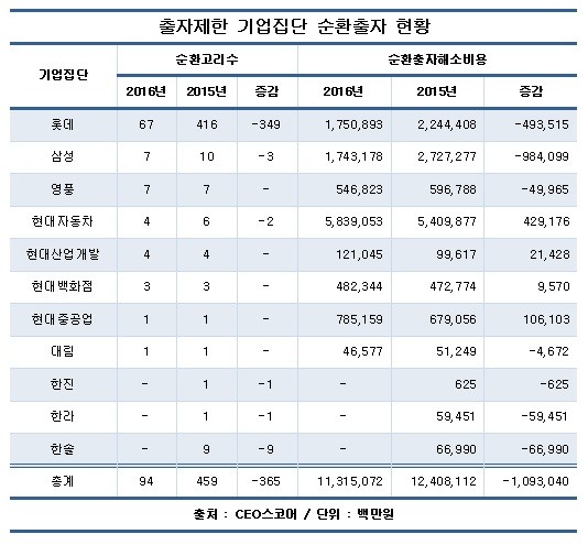 롯데그룹은 순환출자구조 해소에 가장 적극적이다. 지난 2015년 초 416건이던 롯데그룹의 순환고리는 올해 8월 말 67건으로 급감했다. 순환출자해소에 필요한 비용도 같은 기간 2조2444억 원에서 1조7509억원으로 4935억원 감소했다. 호텔롯데가 계열사 주식매입에 나섰던 영향이 가장 컸다.