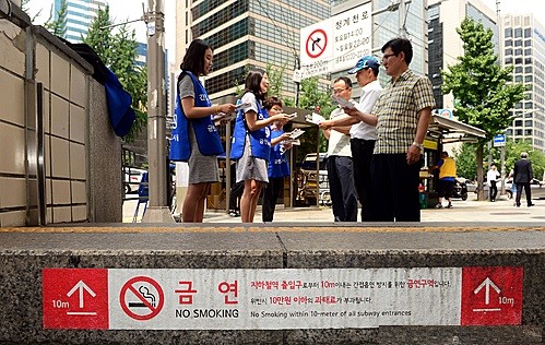 출입구로부터 10m 벗어나면 흡연해도 무방하다는 생각에 금연거리 등에서 담배를 피우다 적발되는 경우를 예방하겠다는 것이다. 표지나 스티커가 없는 출입구는 주변지역까지 금연구역으로 지정돼 있는 셈이다. 주변이 금연거리로 지정돼 아무것도 부착하지 않은 지하철 1·2호선 시청역 2·3번 출구가 대표적이다.