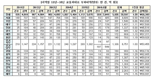 이에 비해 부산은 1인당 0.86건·4만2898원, 서울 0.9건·4만6946원, 경기 1.03건·5만3455원 등으로 나타나 인구 당 교통과태료 부과가 적은 것으로 분석됐다.