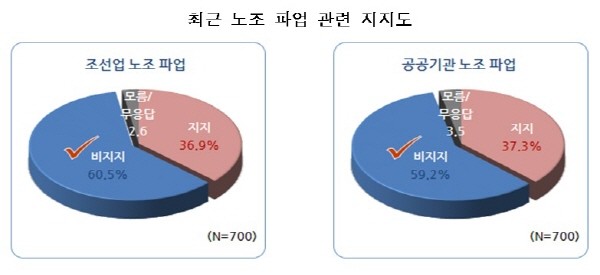 구조조정 중인 조선업 노조의 파업에 대해서 '지지하지 않는다'는 의견이 60.5%를 차지했다. 성과연봉제 도입 반대를 위한 공공기관 노조의 파업에 대해서는 59.2%가 '지지하지 않는다'고 응답했다.